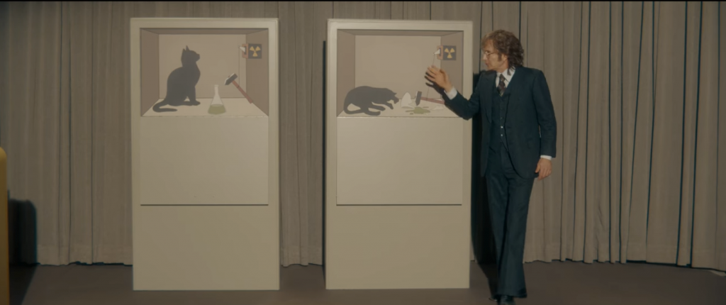 Poste queste considerazioni, condensate in A Serious Man in poche scene taglienti (fatte e non dette, come solo la cinematografia migliore sa fare), i Fratelli Coen alzano ulteriormente l’asticella, applicando all’interpretazione di Copenaghen una delle critiche più eleganti che sia mai stata partorita, ovvero il gatto di Schrödinger. A darci il la è di nuovo un diverbio sul voto di Clive Park, questa volta però verificatosi con il padre dello studente, il quale viene a reclamare direttamente a casa di Larry Gopnik la sufficienza, minacciando di denunciarlo per diffamazione.