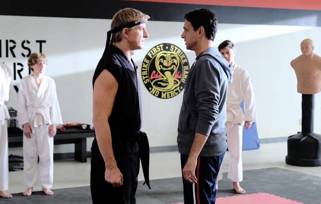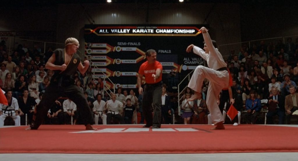 In principio c’era l’antagonista. The Karate Kid (o come è arrivato in Italia Per vincere domani – The Karate Kid) esce nel 1984 e racconta la storia di Daniel LaRusso (Ralph Macchio), sedicenne italoamericano tormentato dalle difficoltà di integrazione dopo il trasferimento dal New Jersey alla California. Il suo principale ostacolo, tanto nell’adattarsi al nuovo ambiente quanto nel conquistare Ali (la ragazza di cui è innamorato) è proprio Johnny Lawrence che pratica karate presso il Cobra Kai, il dojo guidato dal sensei Kreese (Martin Kove). LaRusso e Lawrence, dopo essersi scontrati a più riprese, decidono che per risolvere i dissapori la cosa migliore sia affrontarsi al torneo regionale di karate Under18, per il quale Daniel si preparerà grazie all’aiuto del maestro Miyagi (il mentore per antonomasia nella storia del cinema). Il resto è storia: «Togli la cera, metti la cera» e calci in faccia (letteralmente) per il primo premio.