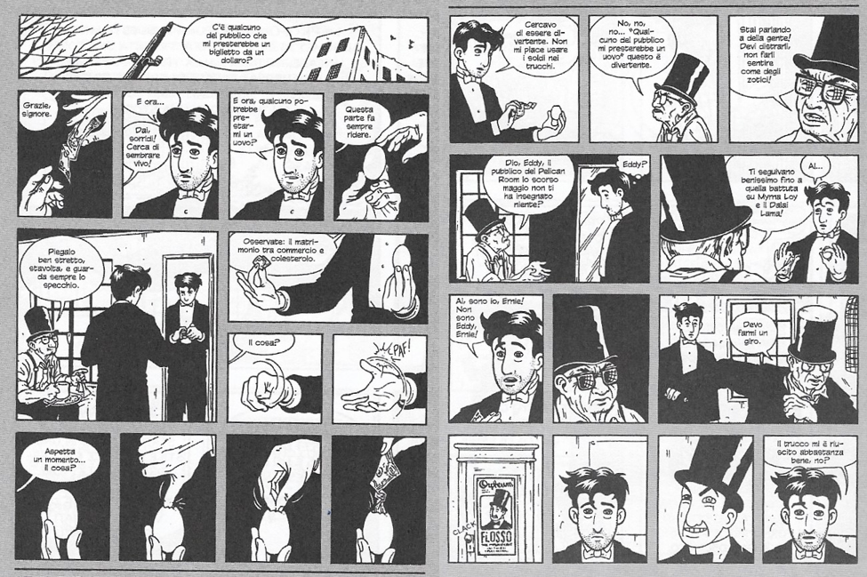 Lutes non è tra i primi a trattare ogni tavola come se raccontasse una storia a sé stante, o a considerare le immagini alla stregua di simboli che vogliono – o possono – significare anche altro al di fuori di ciò che sono. La vera novità sta nei disegni, nel modo in cui dialogano tra una vignetta e l’altra. Lo spiega bene Scott McCloud nel suo saggio Reinventare il fumetto, analizzando la scena in cui il vecchio illusionista aiuta il giovane a trovare un po’ di fiducia, nelle due tavole qui sopra. «Il melodramma è stato scritto in uno stile accessibile», nota lo studioso, «ma i lettori devono leggere tra le righe per vedere premiati i propri sforzi».