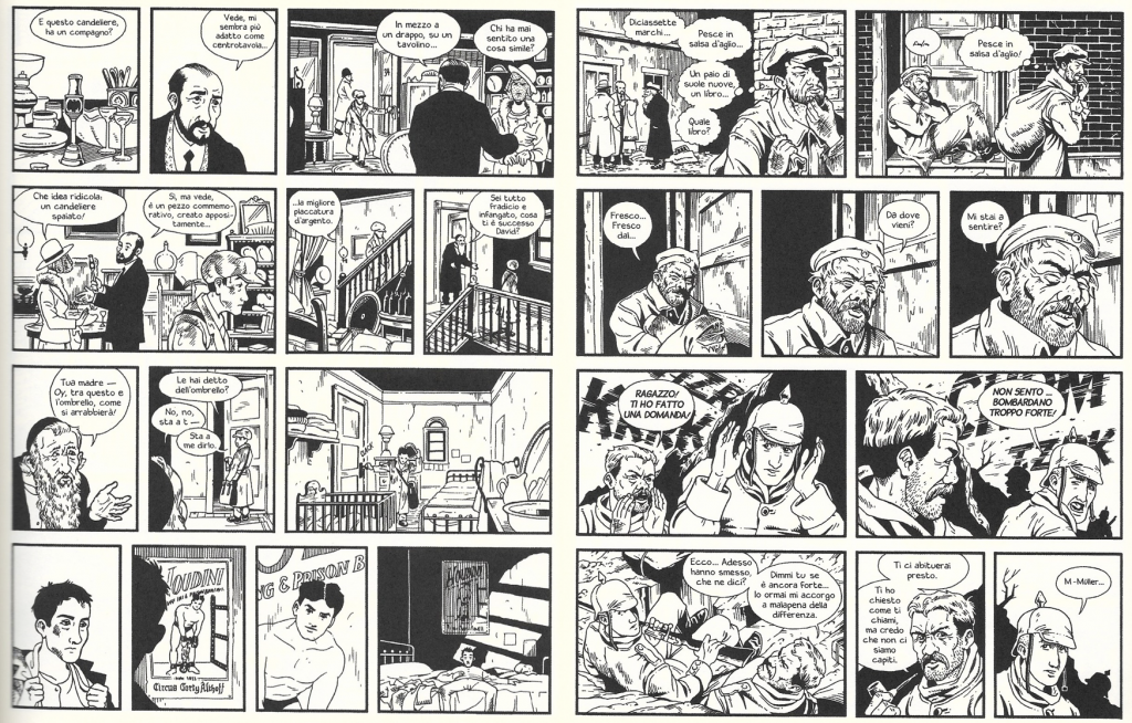 Del giovane David, Lutes rende subito chiara la condizione di prigionia nella prima pagina in alto. Dopo essere – guarda caso – miracolosamente sfuggito a un gruppo di teppistelli nazisti si è rifugiato in camera sua, non prima che il nonno lo abbia redarguito. Su di lui grava tutto il peso della tavola, in bilico tra la dovizia di dettagli e una gabbia impenetrabile. La stessa che viene proiettata nella penombra dalla finestra, nell’ultimo riquadro in basso, proprio dopo una panoramica sul volto dell’escapista. Dal confronto con le vignette in alto, però, la vicenda del ragazzino riflette anche il disagio della sua etnia, compresi i problemi cui doveva far fronte a Berlino negli anni Trenta. Un dramma che riguardava cittadini ebrei di qualsiasi generazione (nonni, figli e nipoti), proprio sulla base della loro cultura e della loro condizione economica riassunta nel padre antiquario, custode di un passato che non troverà pace in alcun futuro.