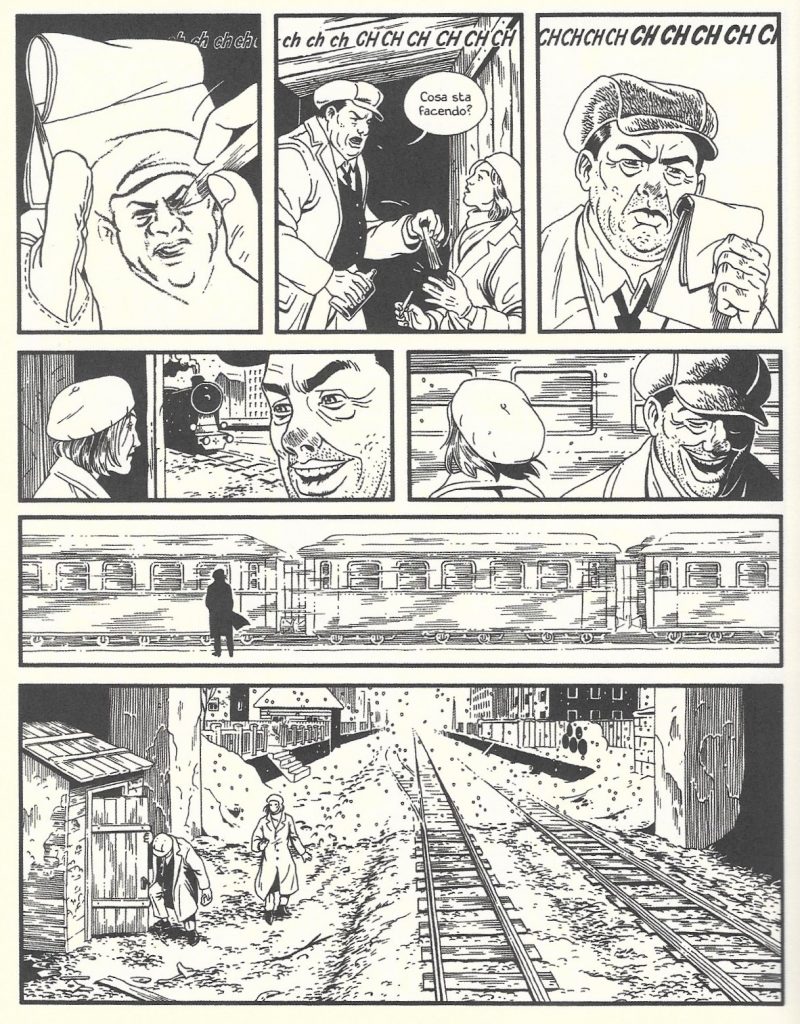 Ma il riquadro più enigmatico resta il penultimo, col treno che scorre da un capo all’altro dell’inquadratura. A che tempo parla l’immagine della sua corsa? Finora Lutes ha usato il presente storico per immergere il lettore nella vicenda, e il passato remoto per i flashback e per le ellissi. Qui però sembra ricorrere a un participio, un tempo verbale che racconta i fatti in leggera differita, posizionandosi alle spalle della protagonista per coglierne la dimensione interiore in un unico colpo d’occhio. Solo così può evocare la «forma del senso interno» di cui parlava Kant, dal punto di vista di un paesaggio scarno e di pura finzione metaforica.