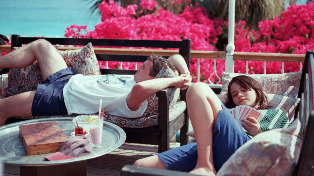 Questo padre tradisce una tristezza profonda, strutturale, che incide sulla capacità di comprensione di Sophie, nonostante lui rimarchi a più riprese la propria genitorialità con obbligati gesti da papà: insegnarle tecniche di autodifesa, metterle la crema doposole, promettersi reciprocamente di raccontarsi ogni cosa. Tutto questo mentre viene eviscerato da Wells spogliandolo di ogni ruolo familiare nel tentativo di riempire delle lacune narrative e mettere in discussione quella summa emotiva prodotta da un ricordo di Calum differente. Tale dinamica è ribadita in alcune riprese girate da Sophie durante le quali inventa eventi mai accaduti e scimmiotta una bambina che si diverte, o nei momenti in cui cerca di interpretare la figlia felice forzando Calum a fare altrettanto, fallendo sempre. Calum il più delle volte riesce a vincere le resistenze di Sophie persuadendola, come quando la convince che quella è stata una bellissima vacanza. La protagonista ricrea un apparato di immagini personalizzato, consapevole che una storia dovrà raccontarsela; l’affezione verso l’altra persona passa anche dalla scelta di cosa ricordare e cosa aggiungere per colmare i vuoti: la stessa Sophie afferma di avere comunque una “videocamera mentale” quando il padre le intima di spegnere quella vera. Sophie è in una fase “creativa”, tesse un reticolato di esperienze che ne faranno un’adulta; è intelligente, più matura della sua età, spia il mondo che la circonda mentre si rapporta al sotteso malessere del padre. È significativa, infatti, la serie di frame che riporta al presente, alla Sophie adulta e al suo ultimo ballo, che completa il linguaggio da un punto di vista più esterno, quasi oggettivo.